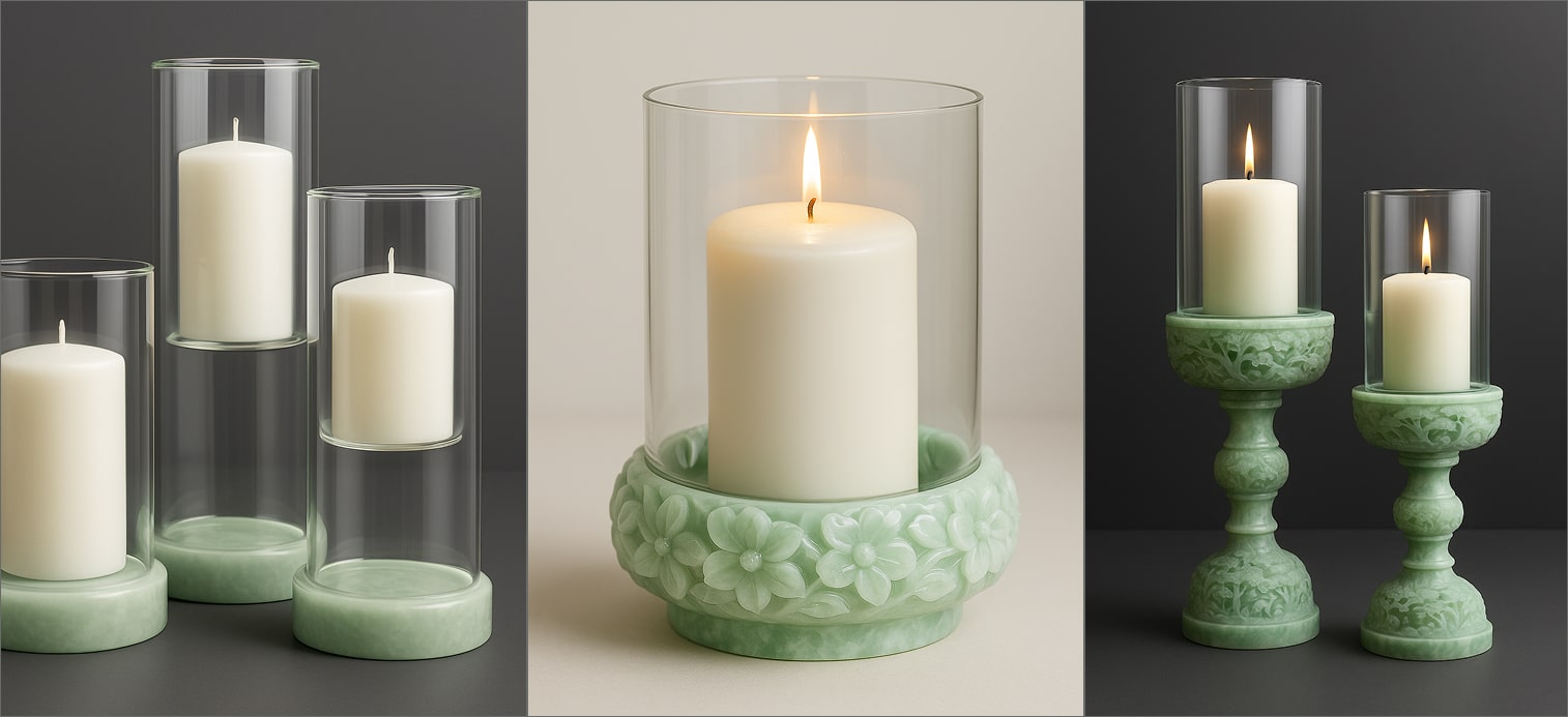 Each candle holder and candlestick is sculpted with precision, highlighting jade’s rich textures and natural tones. Every piece reflects masterful design, bringing refinement and artistry to the ritual of light.
